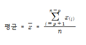 절사평균(Trimmed Mean)은 평균을 ㅈ고ᅟᅳᆷ 변형한 것으로 값들을 크기 순으로 정렬한 후, 양끝에서 일정 개수의 값들을 삭제한 뒤 남은 값들을 가지고 구한 평균입니다. 절사평균은 극단값의 영향을 제거합니다. 예를 들어, 회사에서 평균 연봉은 높다는 자료를 봤는데, 실제로 평균 연봉에 미치지 못한 경우가 많습니다. 그렇기에, 연봉이 가장 높은 사람과 가장 낮은 사람들의 연봉 값 P개를 삭제하고, 나머지의 연봉을 평균내어 사용하는 것입니다.