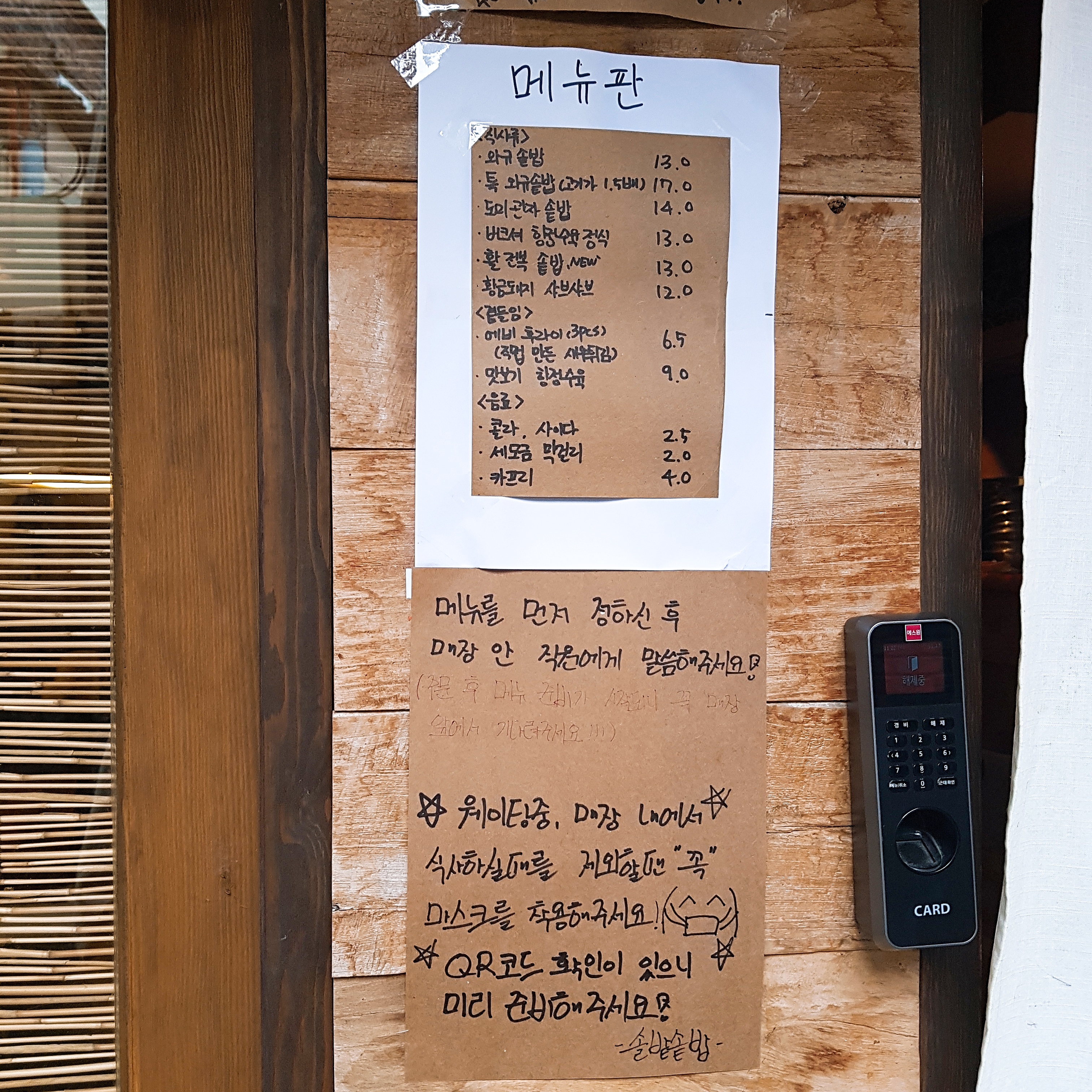 매장 입구에는 간단한 메뉴판과 코로나 19로 인한 방역 지침 등이 적혀 있다.