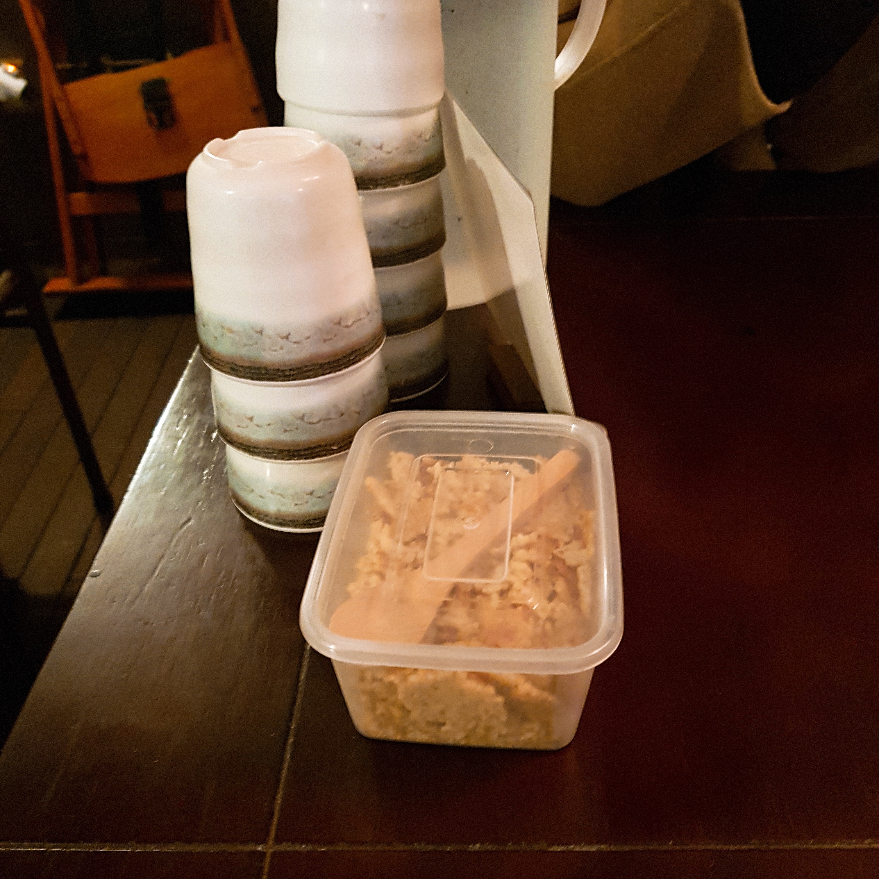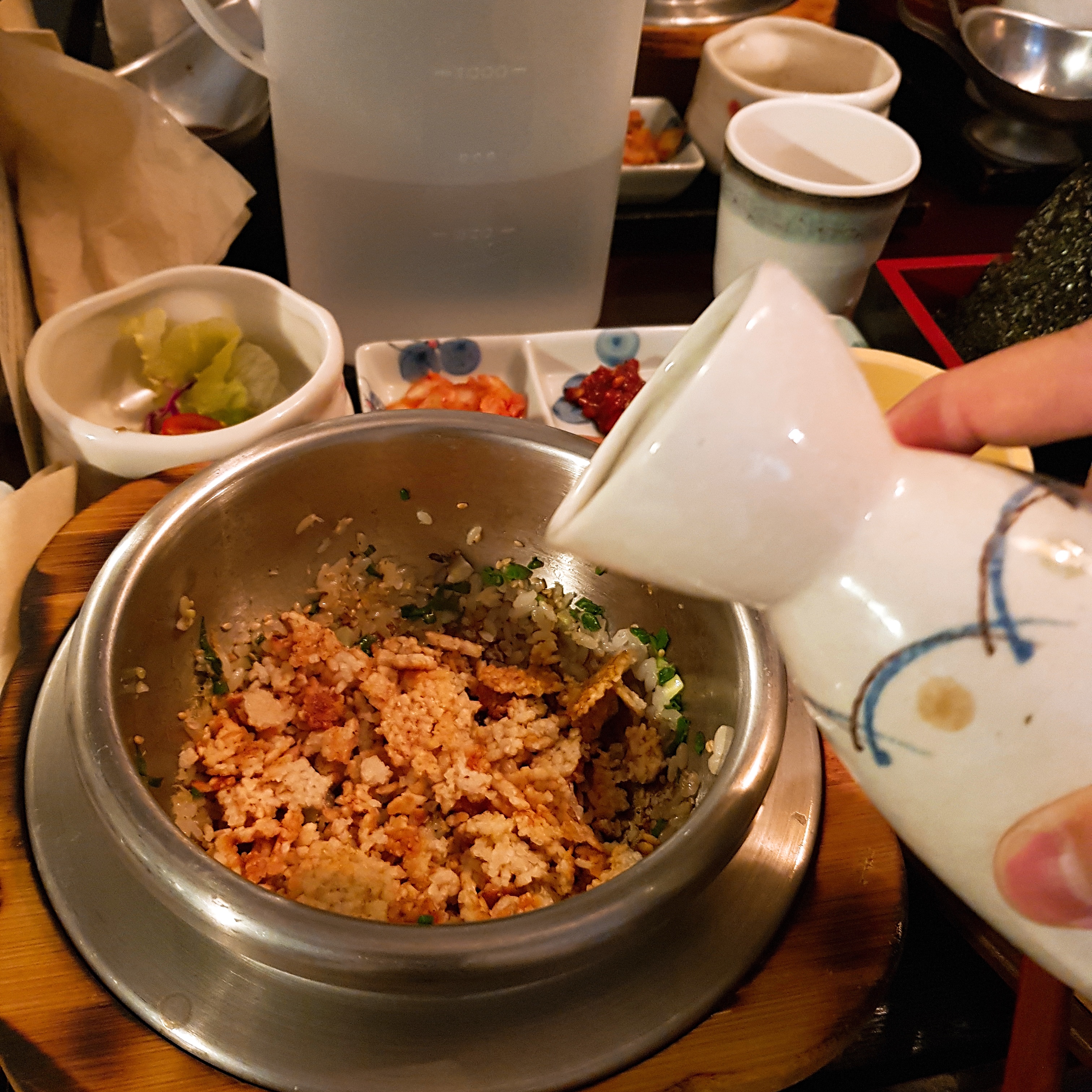 밥을 옮겨 담은 후, 남은 솥에 테이블에 배치된 누룽지를 넣어준다.