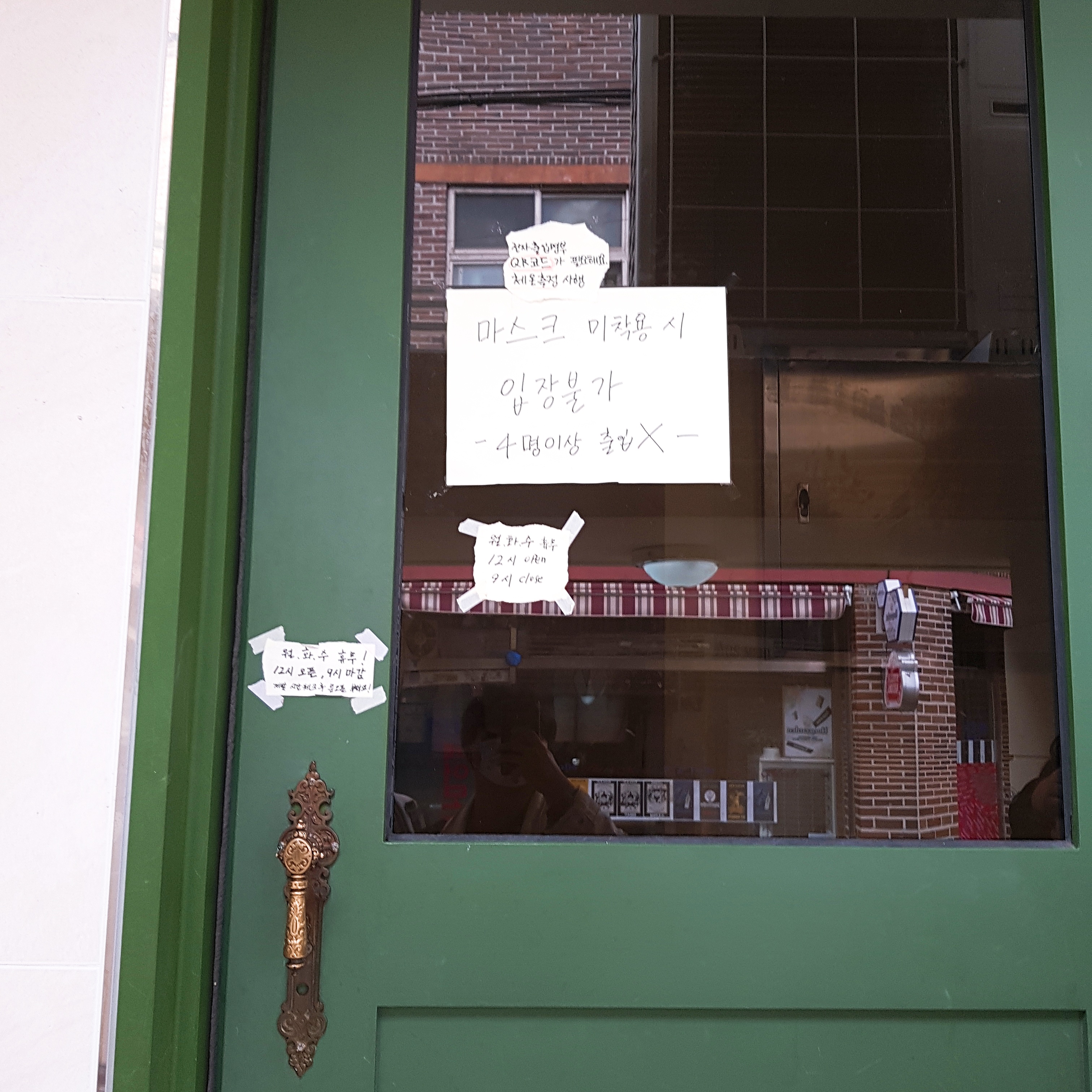 마스크 미착용 시 입장불가고, 4명이상은 출입 불가.