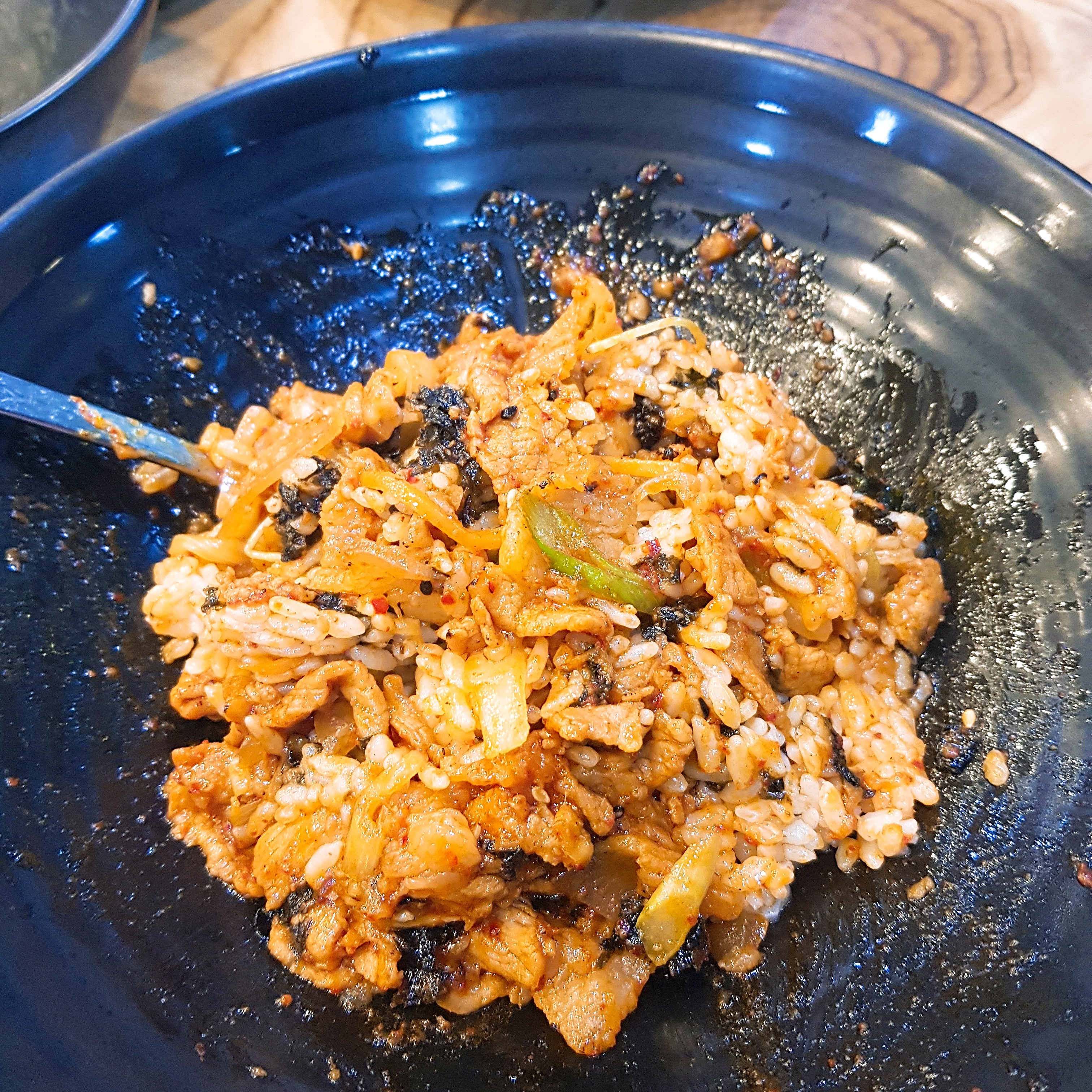 제육덮밥을 먹으면서 다리살의 특유의 껍데기 부분의 식감을 느낄 수 있다.