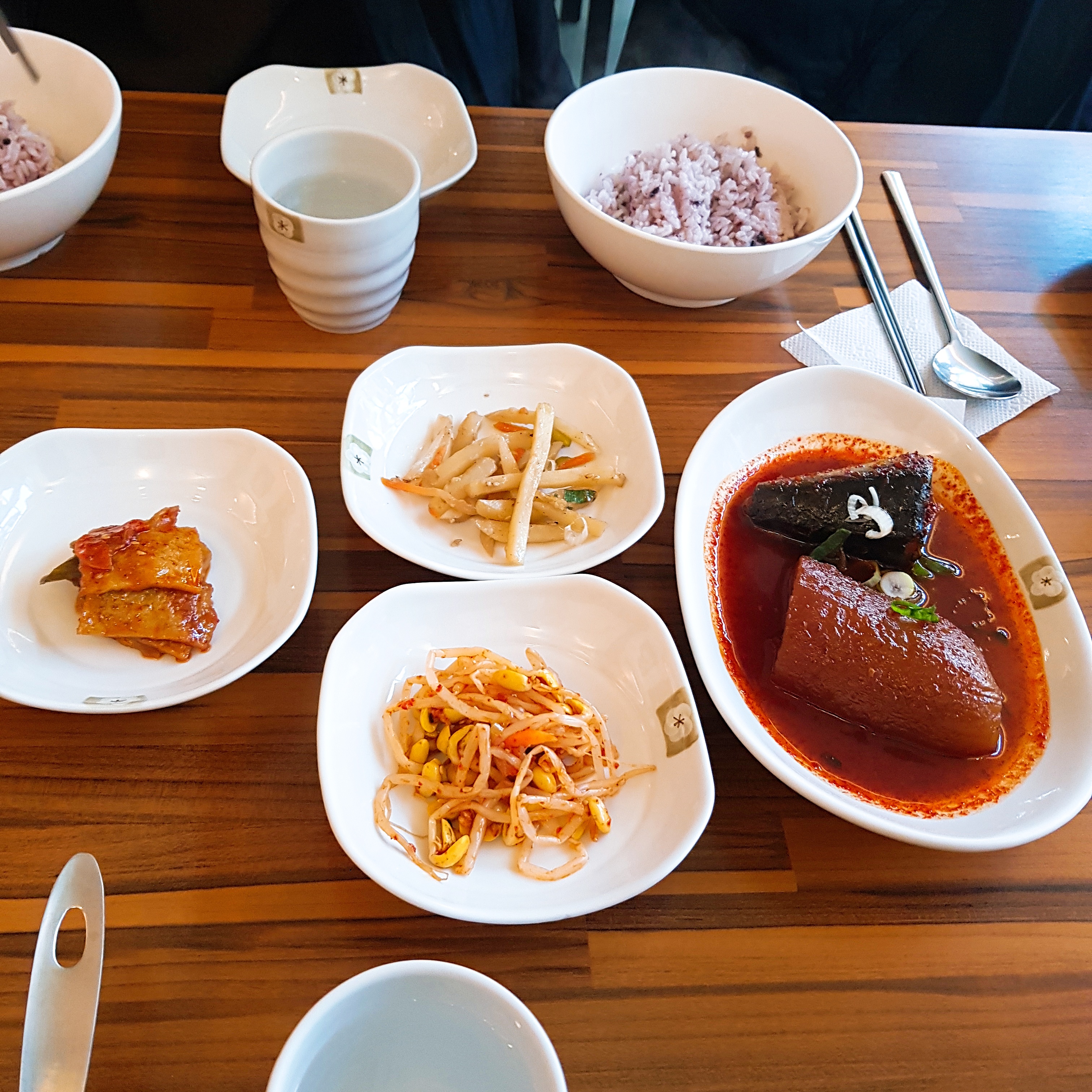 배추김치와 어묵볶음, 감자채볶음, 콩나물무침, 마늘, 쌈장, 상추, 오이고추가 있다.