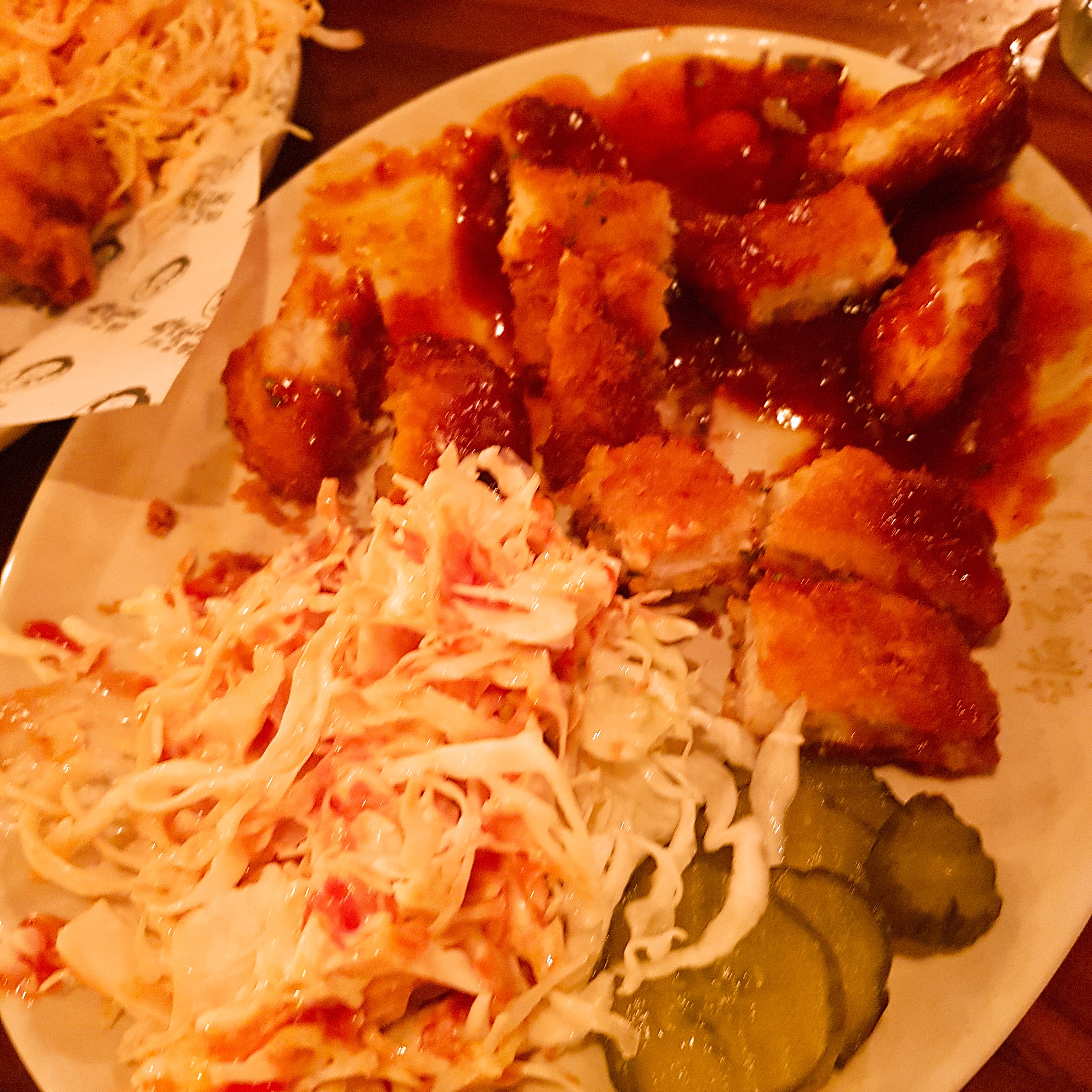 바삭한 돈까스와 핵불맛 소스, 양배추 샐러드, 피클이 플레이팅 된다.