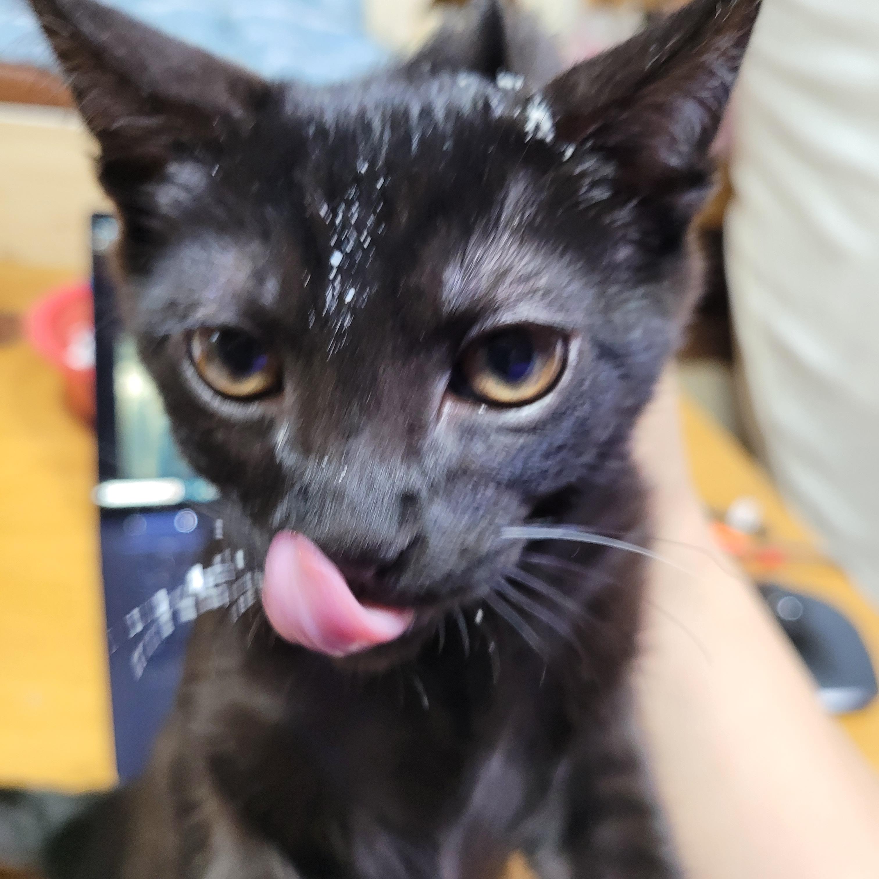 한 마리를 이미 키우고 있었는데, 집 앞에서 새끼 때 아픈 상태에 있으니 모른척 할 수가 없어서 데려왔다고 한다.