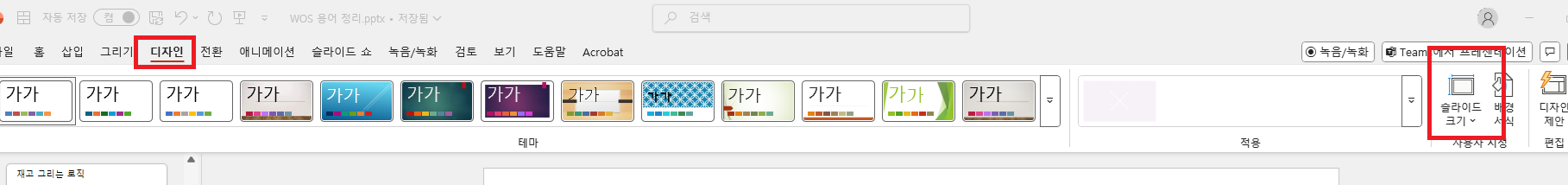 파워포인트에서 PPT를 만들 때 슬라이드 크기를 변경하는 경우가 생긴다. 슬라이드 크기를 변경하는 방법은 디자인 탭에서 슬라이드 크기를 변경하면 된다.