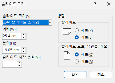 3. [슬라이드 크기] 탭에서 이렇게 너비와 높이 등을 커스터마이징 할 수 있다.
