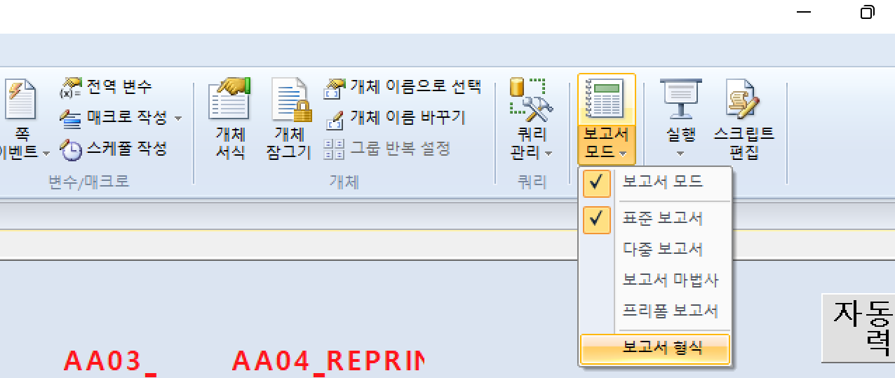 2. [보고서 형식]을 누르면 보고서 형식 지정이 나오는데, 여기서 [쪽 변경 시 매크로]를 클릭한다.