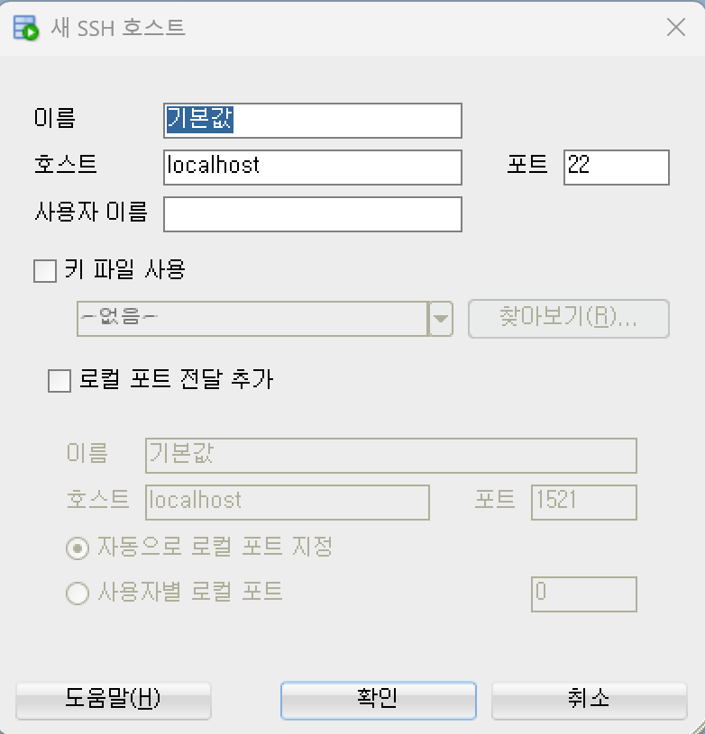 3. [새 SSH 호스트]에서 SSH 접속 정보를 입력하고 확인 버튼을 누른다.