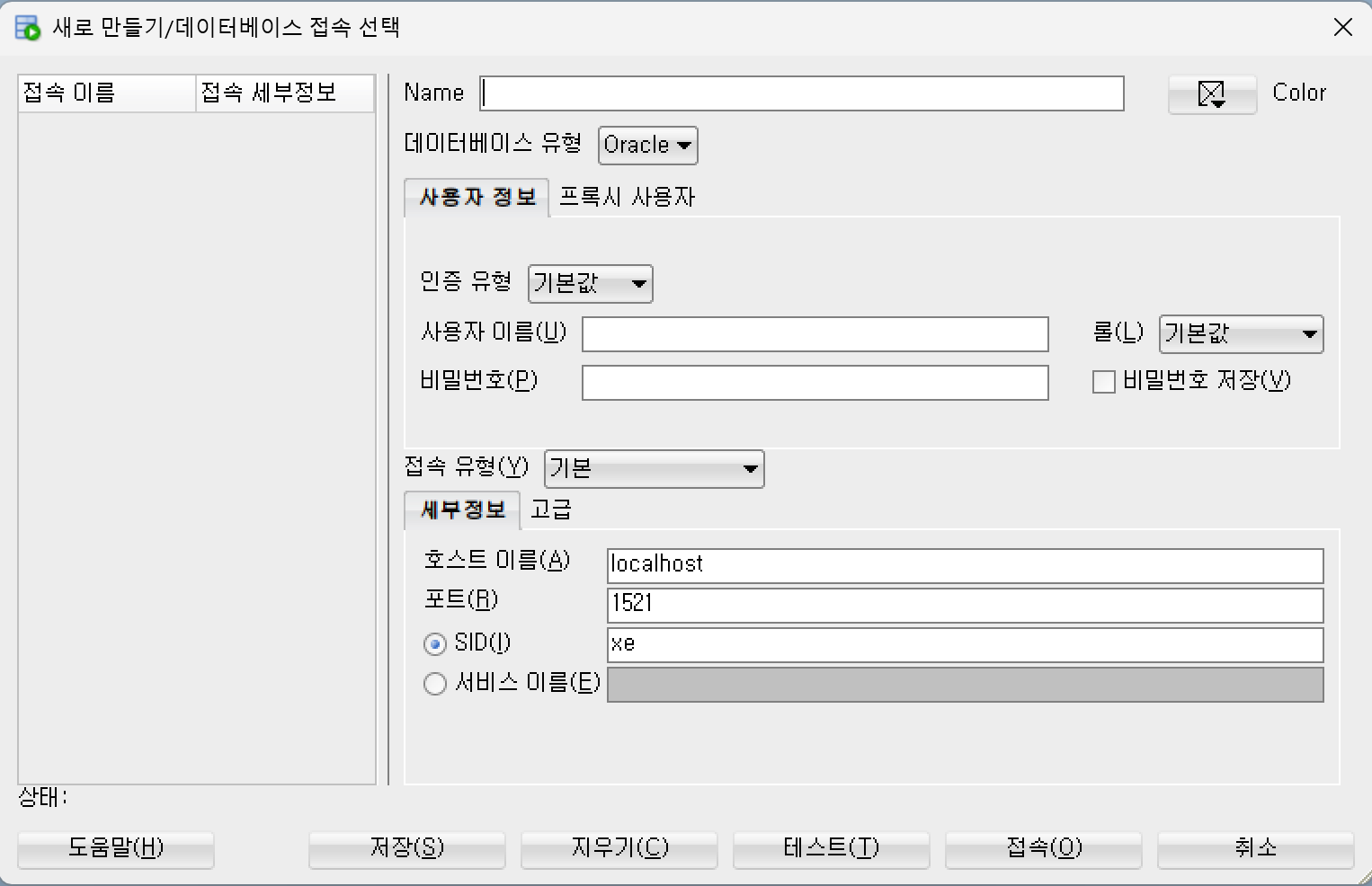 4. SSH 호스트를 만들었으면, DB 접속 정보를 생성하면 되는데, 아래와 같이 사용자이름부터 접속 정보들을 입력한다.