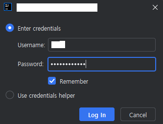 1. 위에서 Log in via Git 버튼을 누르면 아래와 같이 Username과 Password를 입력하여 연결할 수 있다.