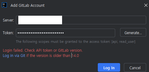 인텔리제이에서 GitLab을 연동하려고 HTTP 주소랑 Token을 넣었더니, 아래와 같이 에러가 발생했다.
