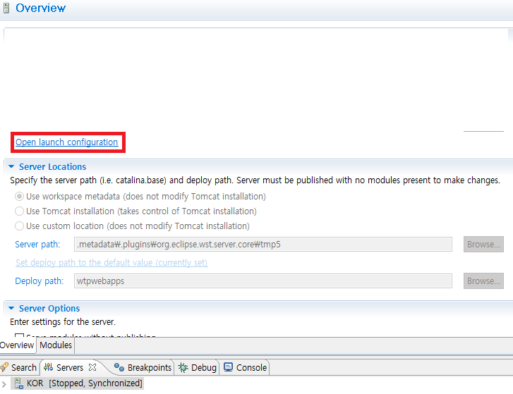 1) 아래와 같이, Servers를 더블 클릭하고, Open launch configuration을 클릭한다.