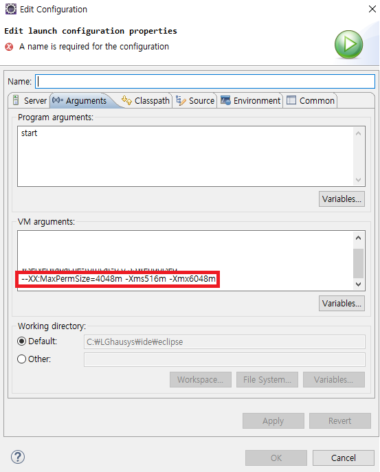 2) 그러면 아래와 같이, [Edit Configuration] 화면이 나오는데, [VM arguments]에 아래와 같이 Perm 메모리 사이즈를 넣어 준다.