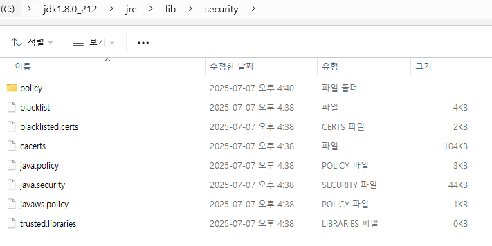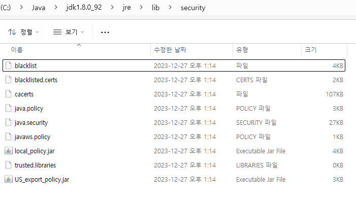 기존에 jdk 1.8.0_92를 사용하고 있었는데, AES 256 GCM을 적용하려고 보니, 해당 jdk에서는 security에서 policy 폴더를 보면 local_policy.jar와 US_export_policy.jar 이 2개가 없다.