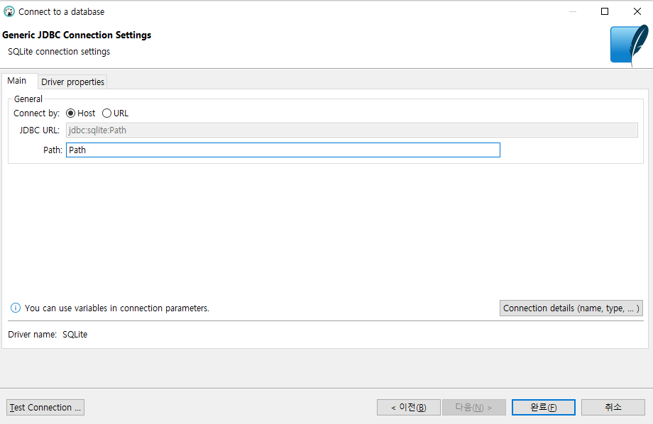 2. [다음] 버튼을 누르게 되면, 아래와 같이 JDBC 연결을 하면 되는데, *.db 파일이나 *.sqlite3 파일 db를 연결한다.