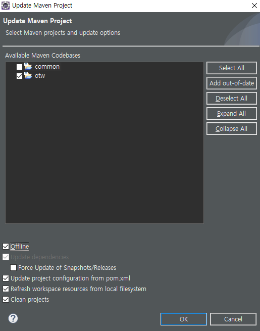 [Update Maven Project]에서 저는 프로젝트의 Maven 라이브러리를 SystemPath를 통해 특정 위치에 넣어놔서 Offline을 체크하고 Maven Update 했습니다.