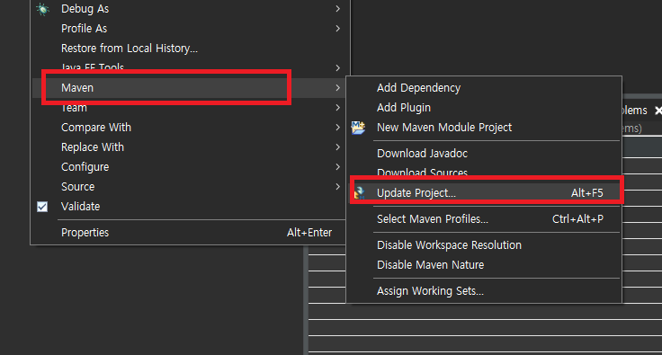 그래서, 아래의 사진과 같이, [프로젝트 오른쪽 클릭] - [Maven] - [Update Project]를 눌러줍니다.