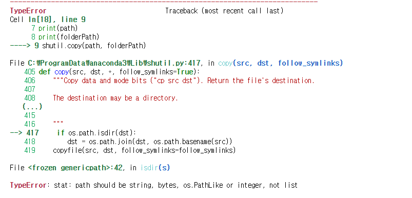 파이썬에서 이미지를 복사하거나 이동을 시킬 때 shutil 라이브러리를 사용한다. 근데, 이미지를 특정 문자를 기준으로 파일 복사를 하려고 했는데 shutil.copy를 사용했더니 아래와 같이 stat:path should be string, bytes, os.PathLike or integer, not list 문제가 발생했다.
